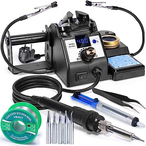 Dieses Lötkolben-Set enthält: YIHUA 926LED-IV 60W digitale Lötstation, 5 Lötspitzen, bleifreier Lötdraht, 2 Hilfshände, ESD-sichere Pinzette, Entlötpumpe, Spitzenreiniger, Reinigungsschwamm, Lötdrahtspender.